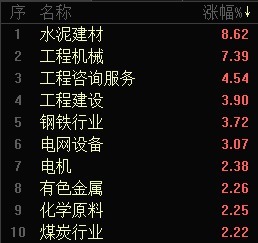 A股水泥建材板块同样以8.62%的涨幅领跑市场。