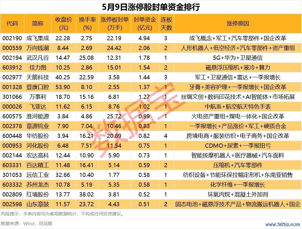 以封单金额计算,8股封单资金超过1亿元,成飞集成和万向钱潮封单资金分别为4.94亿元、2.06亿元;武汉凡谷、佳力图、天箭科技、登康口腔、万事利、飞亚达封单资金均在1亿元以上。